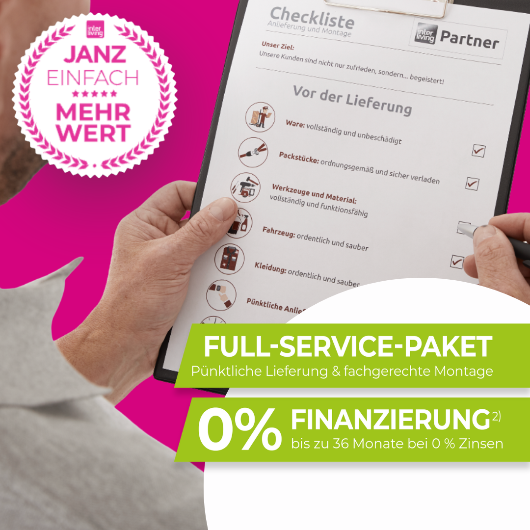 Möchten Sie das Angebot nutzen, aber benötigen die Küche erst zu einem späteren Zeitpunkt? Kein Problem, wir lagern sie kostenlos ein und liefern sie zum vereinbarten Termin. Und für ein entspanntes Budget bieten wir Ihnen unsere 0 %-Finanzierung von bis zu 36 Monaten an.